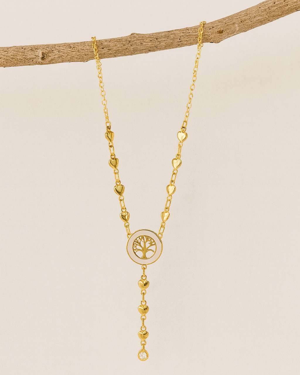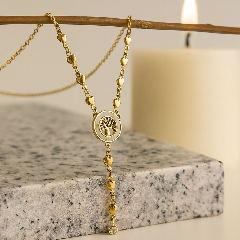 Celebrate connection and elegance with this gold-tone Tree of Life pendant, adorned with delicate heart motifs and a sparkling crystal drop. Thoughtfully crafted in stainless steel with an anti-tarnish finish, this piece symbolizes grounding and grace — perfect for everyday inspiration or a meaningful gift.